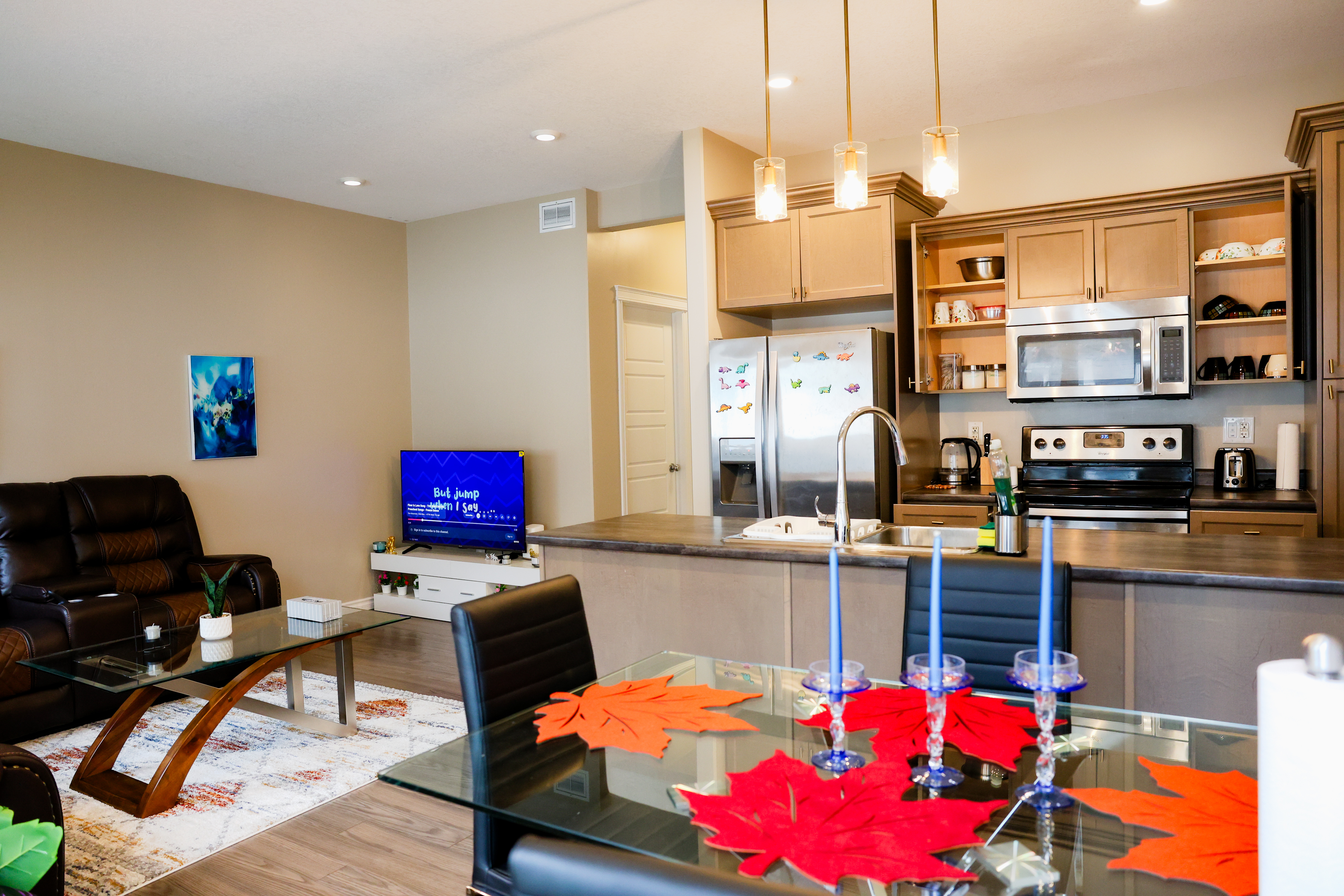 Comfortable living room with sofa, Smart TV and dining space